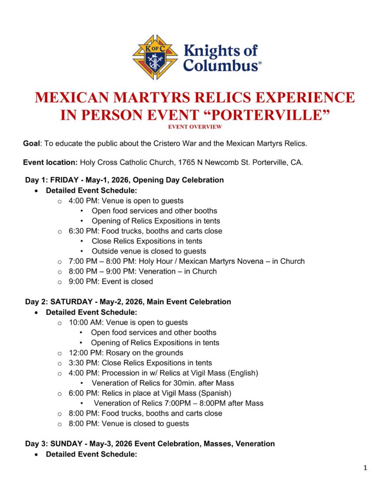 Relics Experience MEXICAN MARTYRS RELICS EXPERIENCE IN PERSON EVENT “PORTERVILLE” (English and Spanish versions) Show English Flyer & Event Overview Show Spanish Flyer & Event Overview